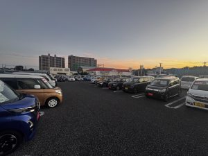 現在、展示場にはすでに約200台の中古車が展示されており、軽自動車からコンパクトカー、ミニバンまで幅広いラインアップが揃っています。夕暮れ時にも整然と並ぶクルマたちを見ていると、オープンへの期待がますます高まります。